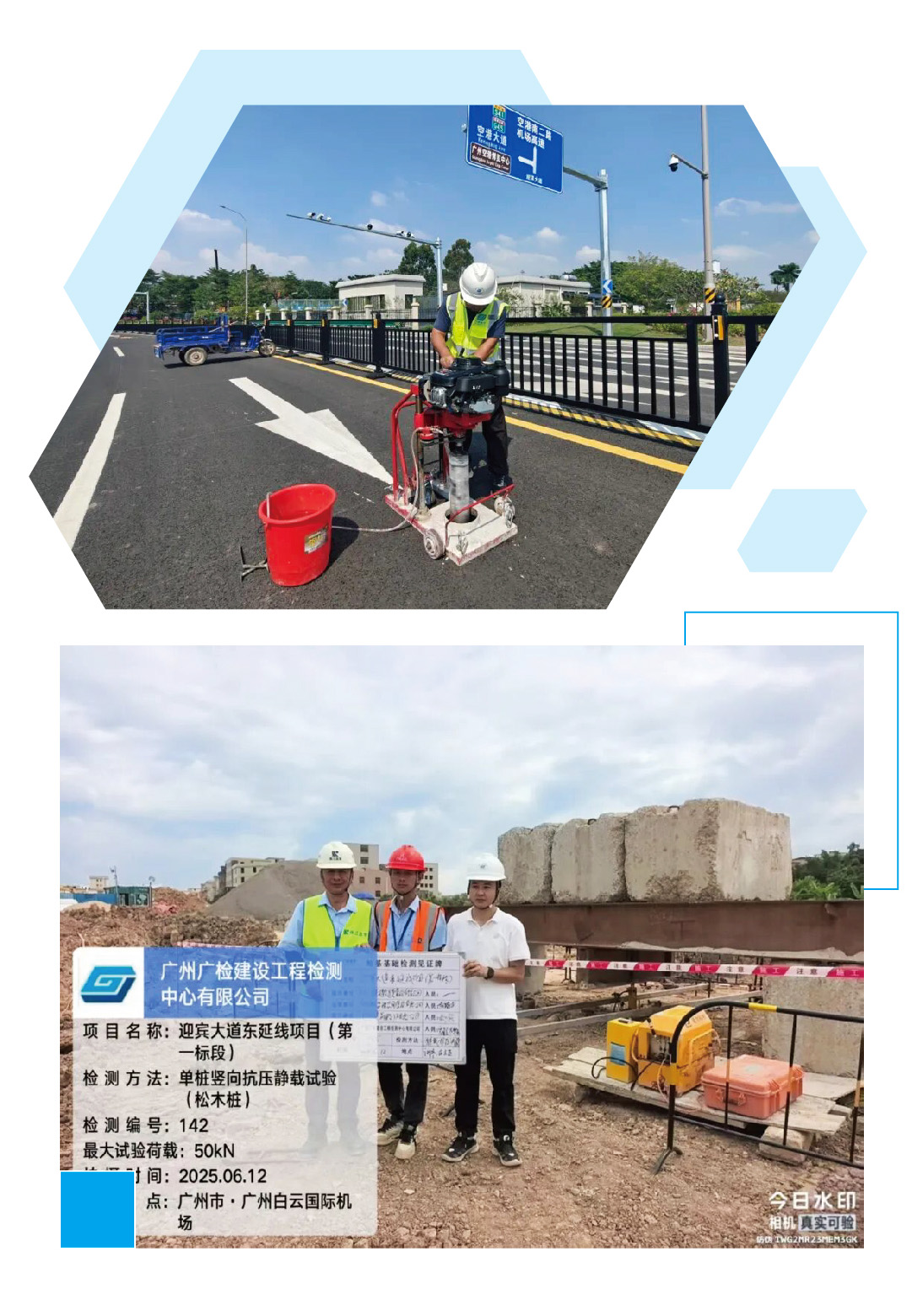 此外,作为十五运会重要交通配套工程——迎宾大道东延线(第一标段)的全过程质量检测第三方机构,广检集团在120天的紧迫工期中,克服高温雷雨等恶劣天气考验,为工程质量筑牢坚实屏障。集团领导多次深入现场调研指导,检测团队坚守“科学、公正、廉洁、高效”方针,严格遵循国家及行业标准,完成各类检测79项。从路基压实度控制、路面结构层检测,到钢筋水泥等原材料性能验证、混凝土构件耐久性评估,检测工作贯穿建设全流程。针对雷雨季节特点,团队加大巡查抽样频率,及时提供数据预警与处理建议,保障特殊气候下施工质量连续可控,助力项目顺利通过竣工验收并投入使用,为全运会交通顺畅提供有力支撑。
